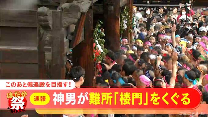 祭の主役「神男」は午後5時頃に楼門をくぐりました。この後、儺追殿(なおいでん)を目指して進みます。