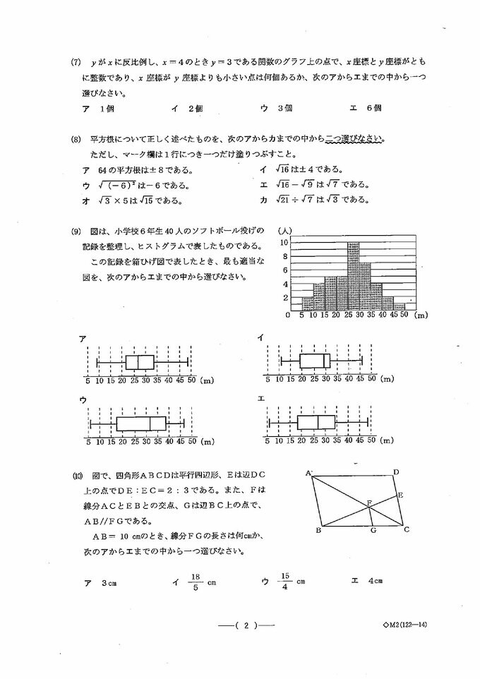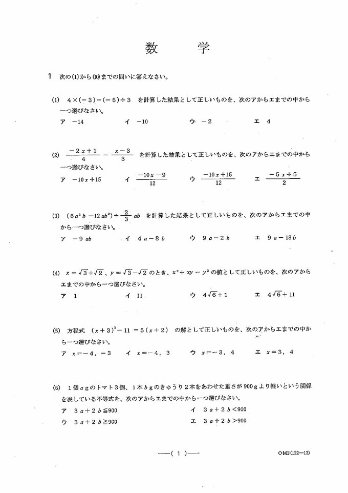 愛知県公立高校入試2024「数学」の試験問題・解答 1問目「4×(-3)-(-6)÷3の正しい答えは?」