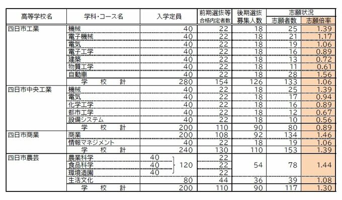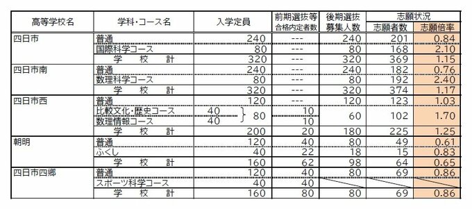三重県公立高校入試2024 志願倍率 後期選抜の出願状況 普通科は桑名1.13倍 四日市0.84倍 津1.21倍 伊勢0.87倍