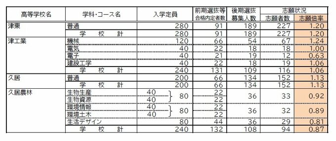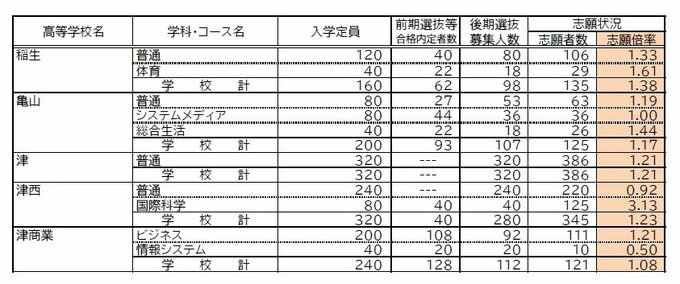 三重県公立高校入試2024 志願倍率 後期選抜の出願状況 普通科は桑名1.13倍 四日市0.84倍 津1.21倍 伊勢0.87倍