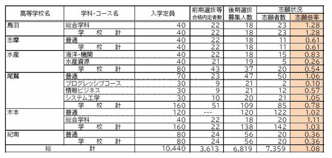三重県公立高校入試2024 志願倍率 後期選抜の出願状況 普通科は桑名1.13倍 四日市0.84倍 津1.21倍 伊勢0.87倍