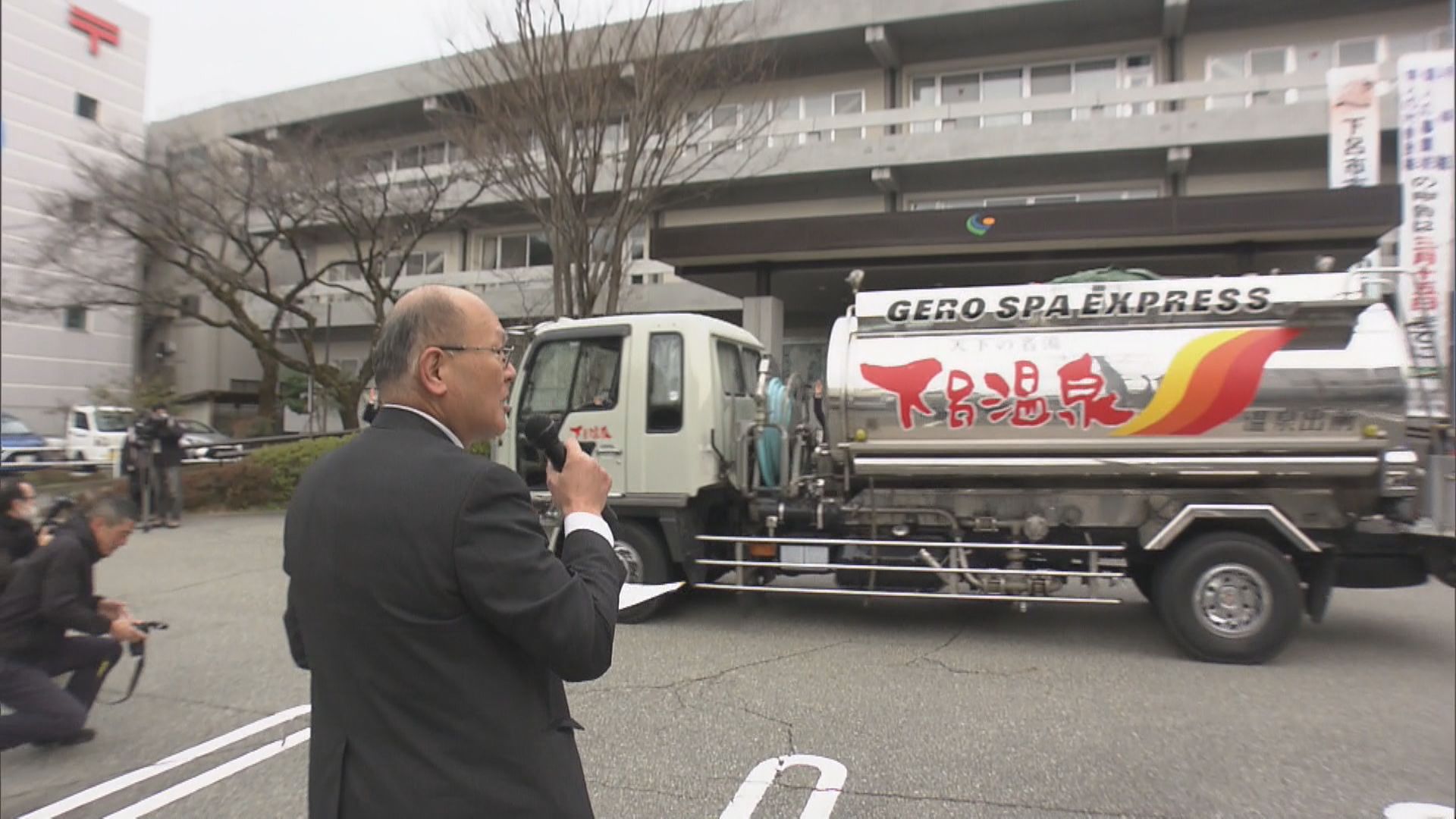 岐阜県の下呂温泉から温泉を届けようと29日朝、湯を運ぶタンクローリーが被災地に向けて出発しました。