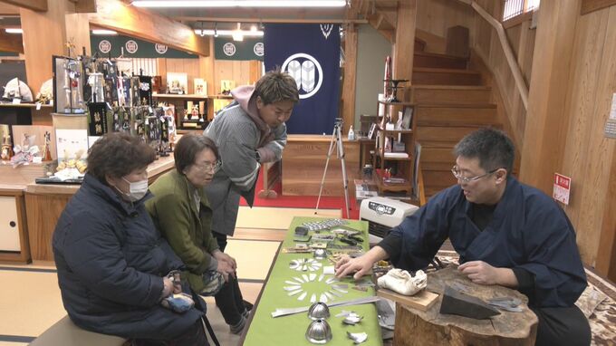 この実演は「江戸時代から続く本来の節句飾りを知ってもらいたい」と、岡崎市の人形店が端午の節句の兜も手がける粟田口さんを招いて行ってもので、訪れた人たちは鉄板から「兜飾り」が作られる工程を興味深そうに見入っていました。