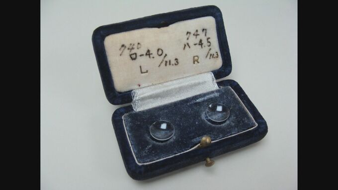 自分の目を使って研究を重ねた田中さんは、1951年に日本で初めて黒目だけを覆う角膜コンタクトレンズの開発に成功しました。