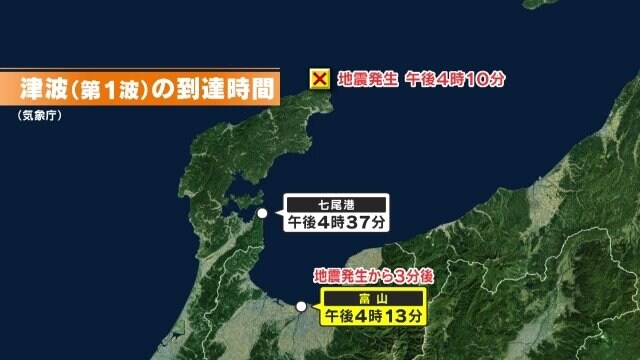 気象庁のまとめによりますと、津波の第一波の到達時間は、震源に近い石川県七尾港で午後4時37分でしたが、そこよりも遠い富山市は、午後4時13分。地震発生のわずか3分後だったのです。