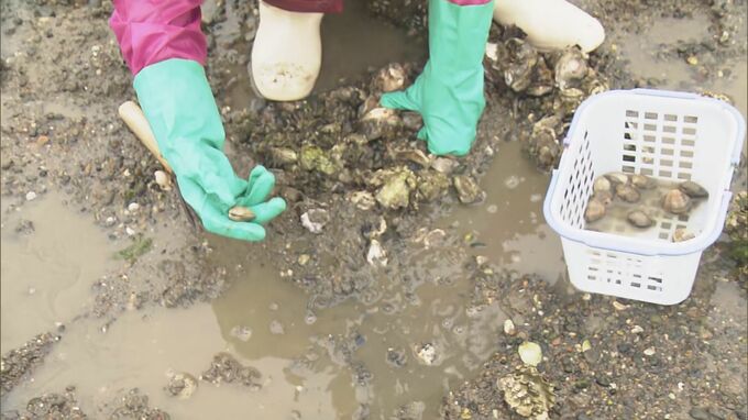 25日は雨にもかかわらず、朝から多くの人が訪れ、次々とアサリを見つけては嬉しそうにかごに入れていました。