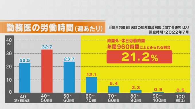 今回の働き方改革で上限となる「時間外と休日労働時間」は年間960時間ですが、それを超えたと見られる「週60時間以上」働いた医師は21.2パーセントでした。