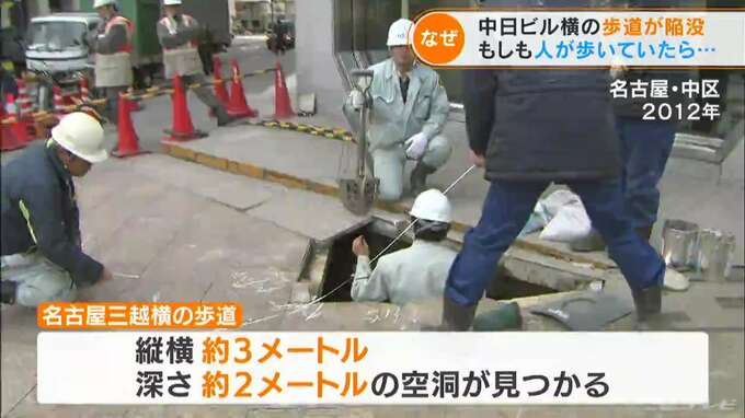 2012年の陥没現場は、今回の中日ビルからほど近い、同じ名古屋・栄でした。松坂屋北館沿いの歩道にあいた穴は縦およそ1.5メートル、横2メートル、深さ1.5メートルでした。