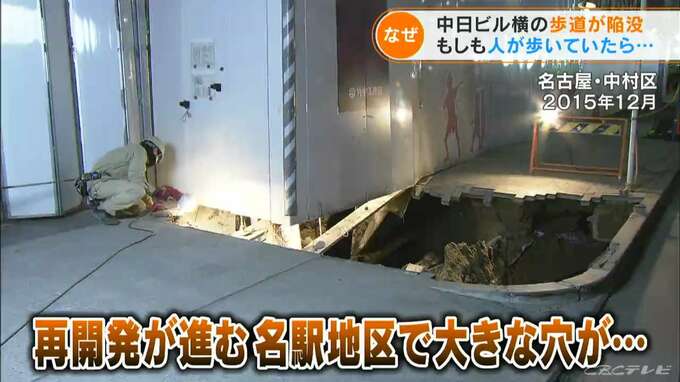 さらに2015年12月。再開発が進む名駅地区でも大きな穴が。この時も幸いけが人はいませんでしたが、穴はおよそ4メートル四方で、深さはおよそ5メートル。穴の横では、地上25階地下2階のビルを建設中でした。