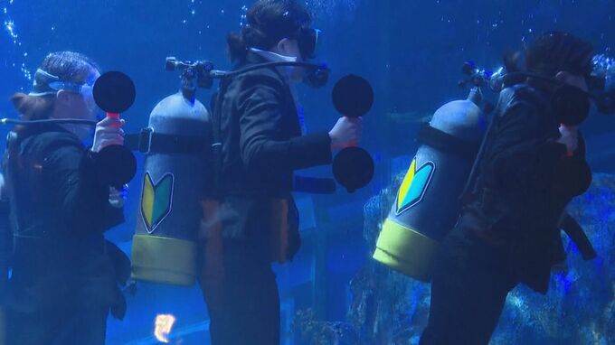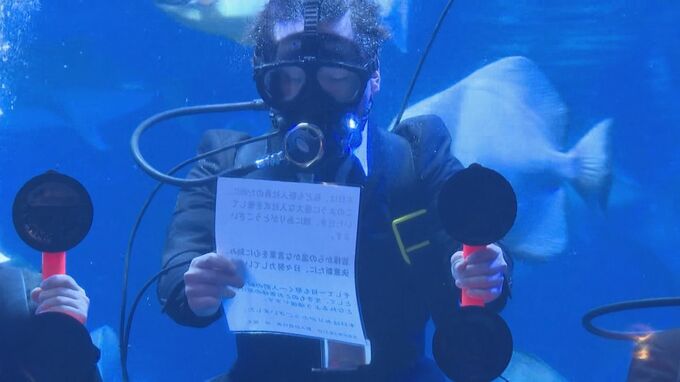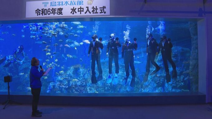 巨大な水槽に登場したリクルートスーツ姿のダイバーたち。その背中には初心者マークも。これは鳥羽水族館が毎年行っている「水中入社式」です。17回目となる今年は、5人の新入社員が3000匹の魚が泳ぐ水槽の中で辞令を受け取り、多くの来場者の前で意気込みを語りました。