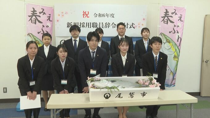 4月1日、三重県尾鷲市の入庁式で、新職員に出世魚のブリが送られました。