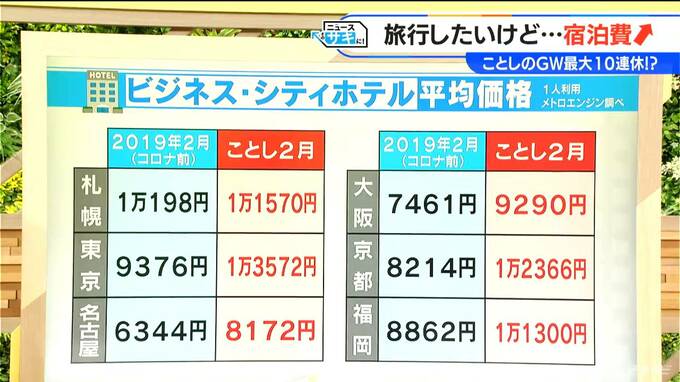 ビジネスホテルやシティホテルを1人で利用した場合の平均価格は、コロナ前の2019年の2月は、札幌だと1万198円、東京は9376円、名古屋は6344円などとなっていましたが(メトロエンジン調べ)、ことし2月にはどの地方を見ても軒並み上昇しているんです。