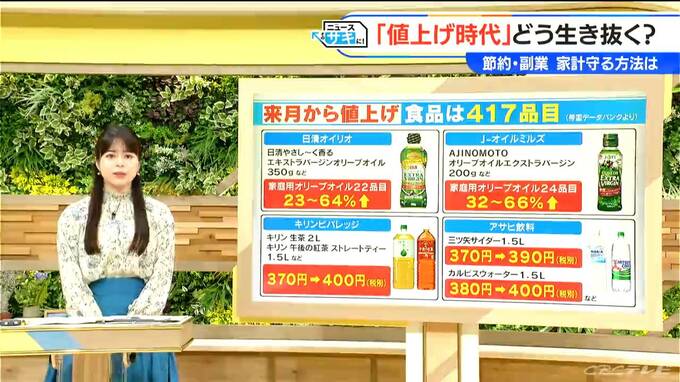 帝国データバンクによりますと、5月から値上げする食品は「417品目」に上るということです。中でもオリーブオイルは最大で60%以上の値上げとなります。また、様々な飲料も値上げということで、キリンビバレッジは「キリン生茶2L」「キリン午後の紅茶ストレートティー1.5L」などを30円値上げします。またアサヒ飲料の「三ツ矢サイダー」「カルピスウォーター」なども値上がりするということです。