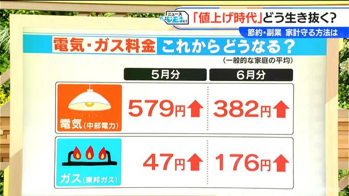 はい、電気やガスの料金も値上げとなります。この地方では5月の検針分から中部電力は、4月分と比べて一般的な家庭の平均で579円の値上がりとなります。東邦ガスは、4月分と比べますと47円の値上がりとなっています。さらに6月分の電気・ガスも値上がりします。なぜかと言いますと、再生可能エネルギーの普及に向けて料金に上乗せされる金額が増えたことや、原料価格の上昇であったり、国の補助金の半減などいろいろな理由があるということです。
