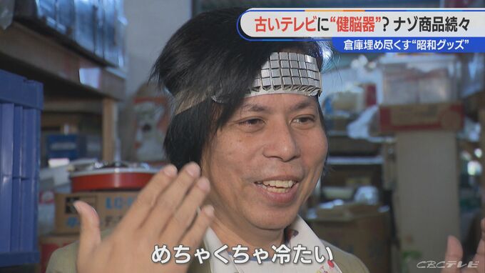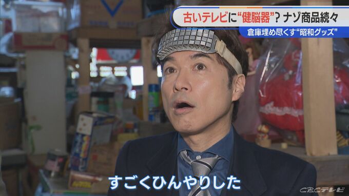 「ちょっとこれおもしろいものを。“ヱヂソンバンド”という頭につけるもので、物の名前としては“健脳器”。昭和15年とか、戦前の商品です。こんな感じで着けるんですが、めちゃくちゃ冷たい。頭が賢くなるものなんです」