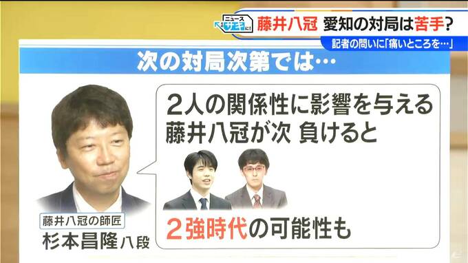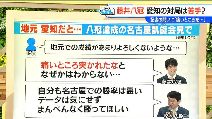 「痛いところを突かれたなと。なぜかわからない」と答えました。会見に同席した師匠の杉本八段は、「自分も名古屋での勝率は悪い、データは気にせずまんべんなく勝ってほしい」とフォローを入れました。