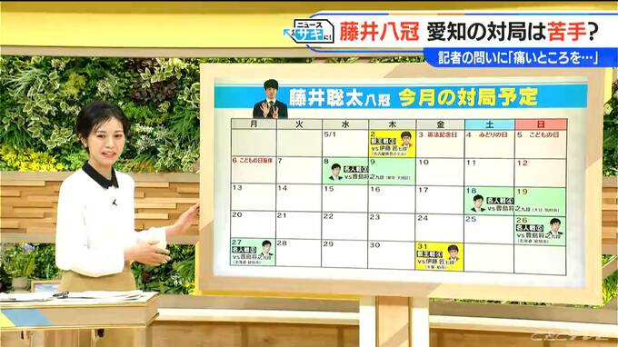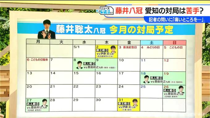 はい。5月8日に名人戦が始まって、まずは東京からです。その次の週18日が大分での名人戦、さらにはその次の週26日に北海道の名人戦。相手は豊島将之九段(34)です。そして、その間があくと言っていた叡王戦は、5月31日ですね、こちら千葉県となります。