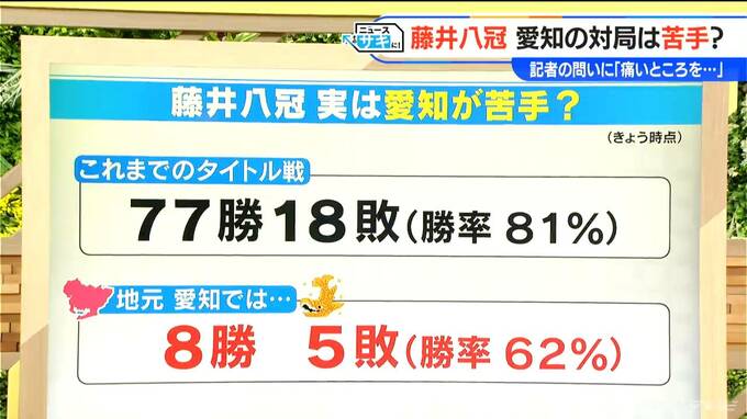 実は藤井八冠は「地元が苦手なんじゃないか」というデータがあるんです。これまでの藤井八冠のタイトル戦の通算成績は77勝18敗で勝率81%です。ただ、地元愛知に限って言いますと、8勝5敗の勝率62%で、これ、地元が苦手なんじゃないかと思うような…。