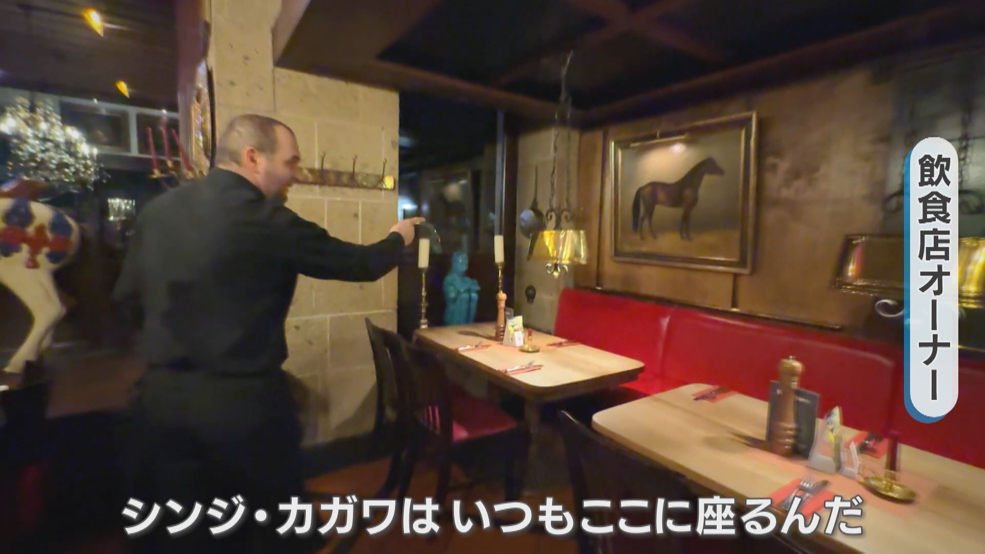 「シンジ・カガワを紹介するよ。彼が店を祝うためにくれたシャツだよ。シンジ・カガワはいつもここに座るんだ。彼のお気に入りの席さ!」