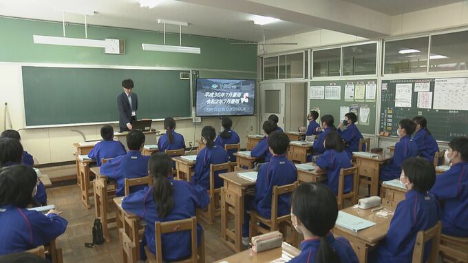 14日は災害時の命の守り方について考えてもらおうと、市の担当者が小坂中学校の1年生26人に、被災時の心構えやハザードマップの活用方法などを伝えました。