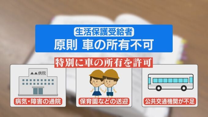 そもそも生活保護の制度では原則、受給者には車の所有が認められていませんが、国は、通院や生活上やむを得ない場合は自治体の判断で認めてもいいという通知を出しています。