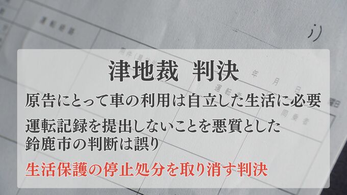 津地裁は、原告にとって車の利用は自立した生活に必要と認めたうえで、運転記録を提出しないことを悪質とした鈴鹿市の判断は誤りだと判断して、生活保護の停止処分を取り消す判決を言い渡しました。