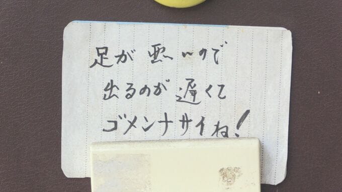 50メートル歩くことも困難で、玄関にはこんな貼り紙も…
