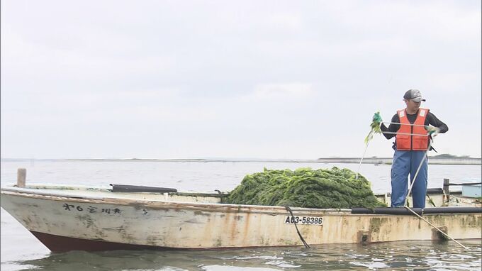田原市沖の三河湾は全国有数の「アナアオサ」の産地で、22日も朝早くから漁師が漁具を使って海中からアナアオサを引き上げる作業に追われていました。