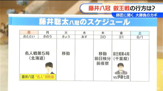 第4局が行われる5月31日(金)までの藤井八冠は大変忙しいんです。きのう(27日)までが北海道での名人戦で、きょう(28日)は移動日です。次の対局までは、あす(29日)は予定がないんですけれども、あさって(30日)には千葉県に移動して、前日検分と前夜祭が行われるので中1日しかないわけです。