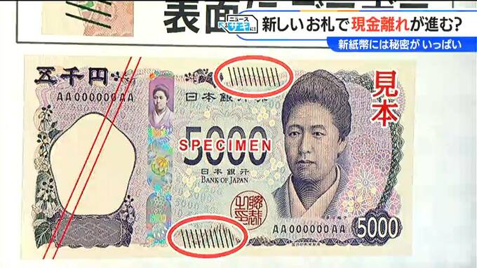 さらにもう一つ大きな特徴がありまして、まず新一万円札を見てみますと、左右に斜線がついています。これは、識別マークと言って、指で触ってわかるように表面にでこぼこと装飾が施されているというものなんですが、これは他のお札ではどこに入っているのかというと、千円札は左下と右上。五千円は上と下。これマークは
