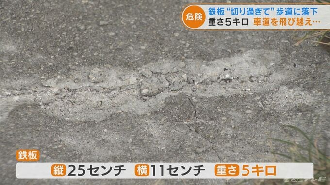 鉄板は縦25センチ、横11センチで重さは5キロ。歩道に落ちた後、近くを歩いていた男性のかかとに当たり、男性は軽いけがをしました。