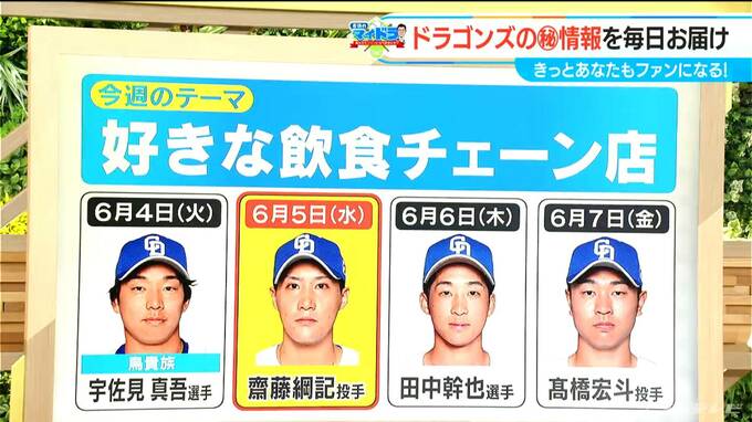 今週のテーマは、好きな飲食チェーン店第2弾。きょうは、齋藤綱記投手です。まずはプロフィールをご紹介します。