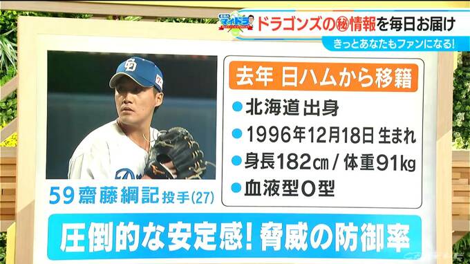 去年、日本ハムファイターズから移籍してきました。北海道出身、1996年12月18日生まれの27歳です。身長182センチ、体重91キロ。圧倒的な安定感で、脅威の防御率。ドラゴンズには、なくてはならない左のリリーバーです。