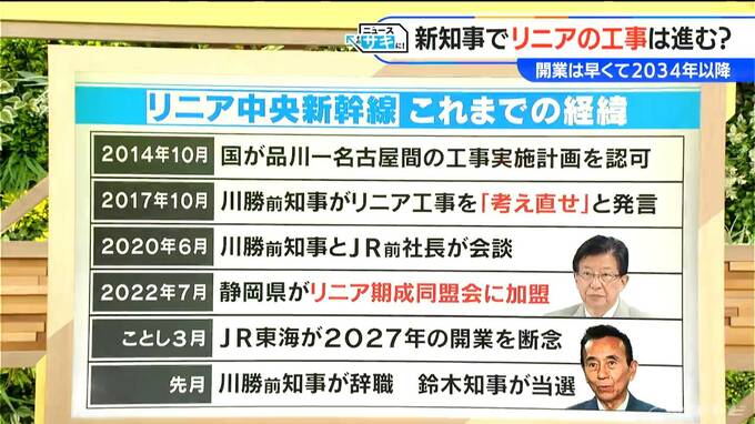 そして、ことしの3月にJR東海が2027年の開業を断念し、5月には川勝前知事が不適切発言で辞職し、鈴木知事が当選という流れになっています。