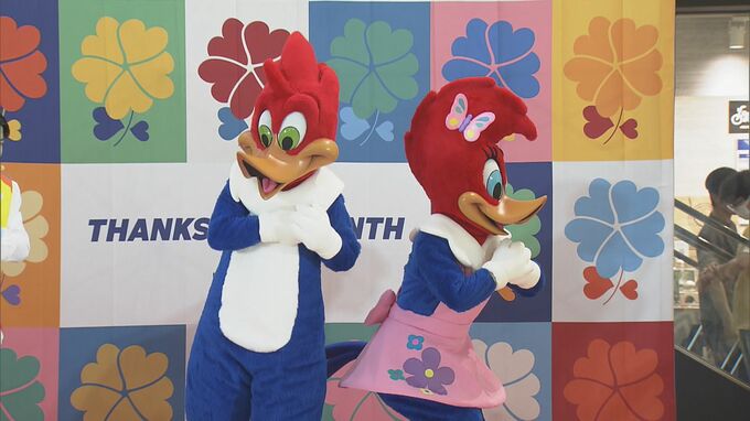 豊川市のイオンモール豊川では、セサミストリートに登場するエルモやクッキーモンスターなど人気キャラクターのショーが行われ、観客と一緒に踊って大切な人にありがとうの気持ちを伝えたほか、来場者にメッセージカードと花およそ400セットが配られました。