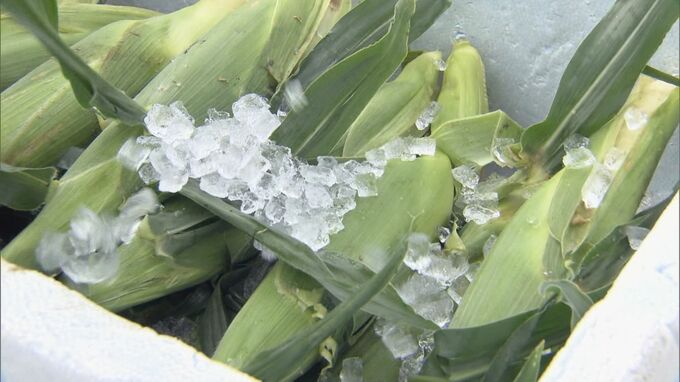各務原市にある「備中農園」の栽培場では今が収穫の最盛期で、摘み取られたとうもろこしは鮮度を保つためその場で氷詰めにされました。