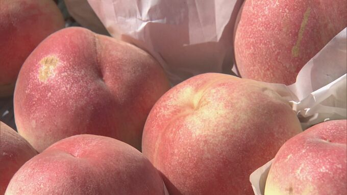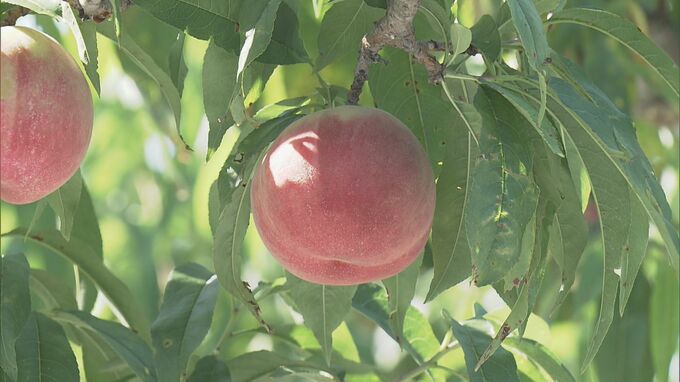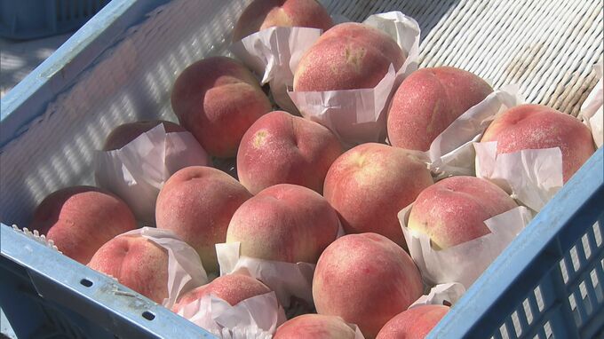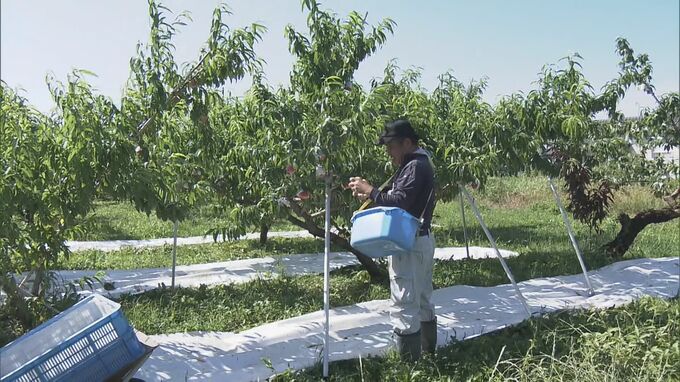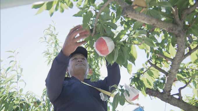 市内にある坂田至さんの農園でも朝から一つ一つ、モモを丁寧に収穫する作業に追われています。ことしは春先の寒さで生育が心配されたものの4月以降の暖かさで、例年通り甘いモモに仕上がったということです。