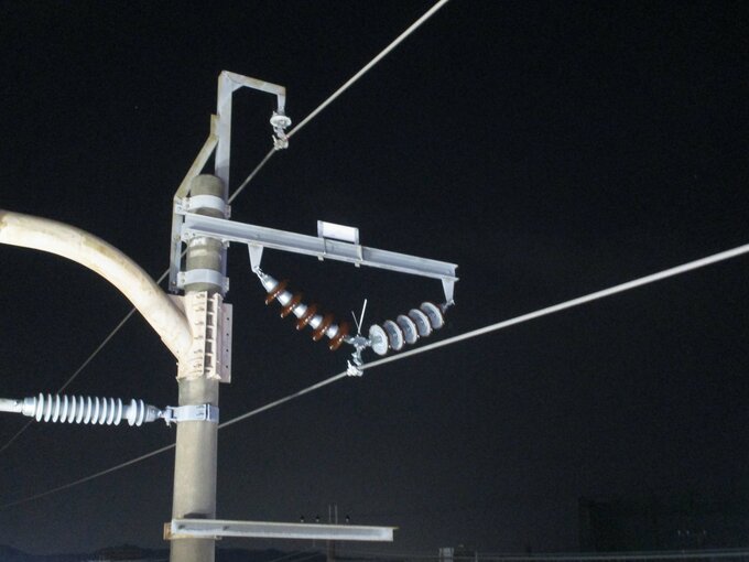 「がいし」は電線から電気が流れ出ないように電線と電柱などの間に使用されていますが、沿岸部などでは海水に含まれる塩などががいしに付着することで、絶縁性能が低下します。