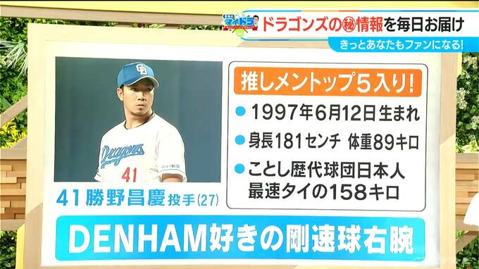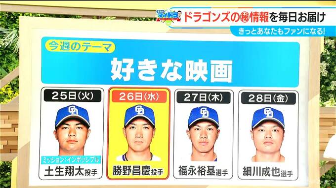 今週のテーマは好きな映画。きょうは勝野昌慶投手(27)です。プロフィールをご紹介します。1997年6月12日生まれ。身長181センチ・体重89キロ。今年「推しメントップ5入り」しました。そんな勝野投手が好きな映画とは…