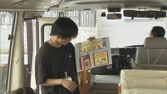 園児らは手が届く低い位置に取り付けられた非常ボタンを押したり、運転席のクラクションを鳴らしたりして、車内に取り残された際の対処法を学びました。
