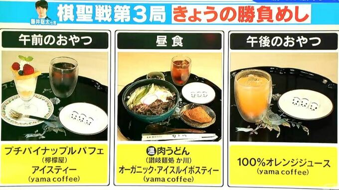 (柳沢)午前のおやつは、藤井七冠は檸檬屋さんの「プチパイナップルパフェ」とyama coffeeさんの「アイスティー」、CBCテレビの将棋担当記者によるとパイナップル好きという調査が出ていましたが、やはり選ばれました。