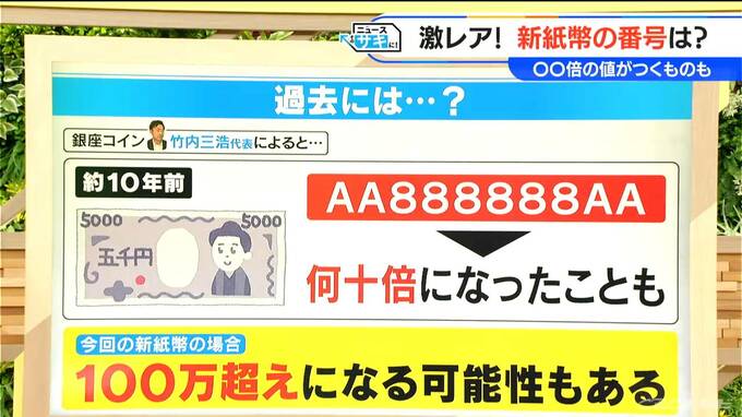 約10年前、樋口一葉が肖像画の5千円札で「AA888888AA」というお札があったそうで、何十倍の価値にもなったそうです。