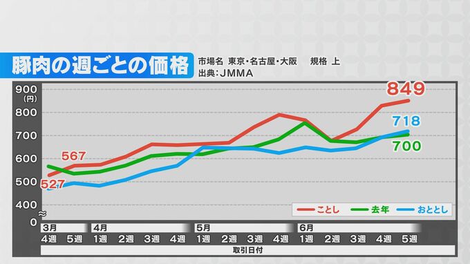 東京、大阪、名古屋の市場で取引された豚肉の週ごとの価格は、3月後半には1キロあたり500円台だったのが、先週には849円と「急騰」。