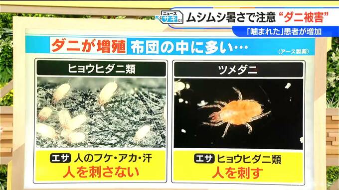 ダスキンによりますとベッドやソファやカーペットなどに生息していると。私たちは眠っている間に汗をかくため、睡眠中の発汗で湿度が高くなる布団の中に多いということなんです。