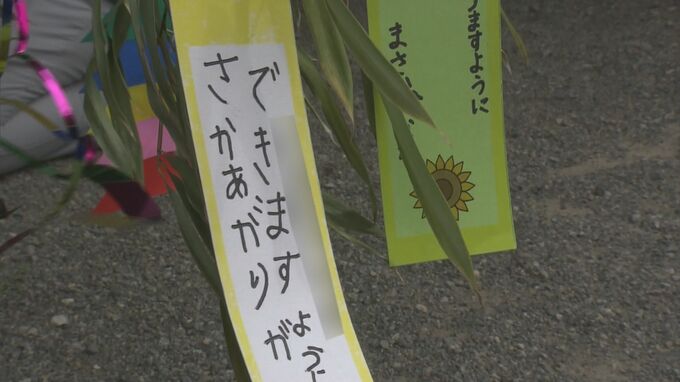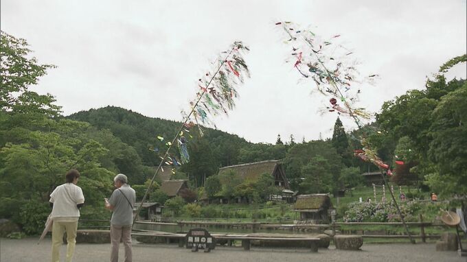 19日は高山市の観光施設「飛騨の里」で、地元の園児たち36人が七夕を前に願い事を書いた短冊を高さ10メートルにもなる大きな笹に飾り付けていきました。