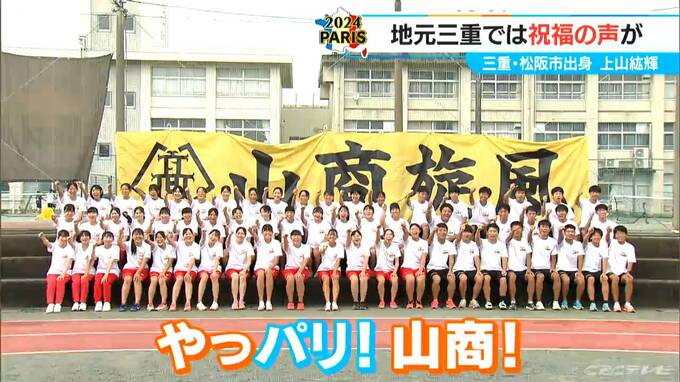 「上山先輩!パリ五輪出場おめでとうございます!巻き起こせ、山商旋風。やっパリ!山商!」と、宇治山田商業高校のみんなが応援。