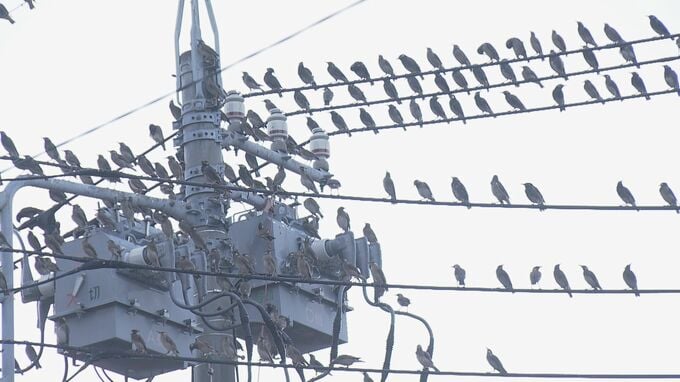 「街路樹に鳥の大群が!電線の上にもびっしりいます」