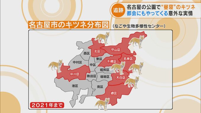 なごや生物多様性センターによると、名古屋市内のキツネは元々、市北部の守山区周辺で見られただけでした。しかし2021年までに、守山区以外にも北区・名東区・千種区・天白区・緑区・中川区の7つの区で確認されています。