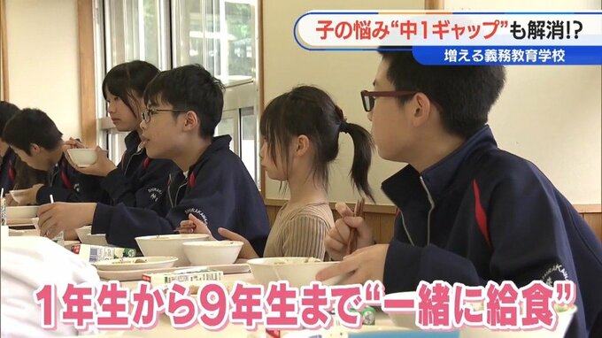 給食は1年生から9年生まで一緒に食べます。こうした環境は、中学入学時に新しい環境に馴染めなかったり、授業についていけなくなったりする「中1ギャップ」の解消としても期待されています。