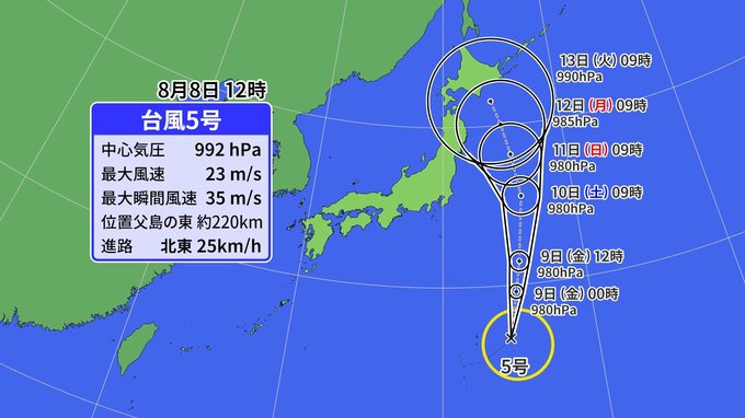日本の南の海上には「熱帯低気圧」が2つありましたが、一つは消滅。気象庁によりますと、父島の東の海上にある「熱帯低気圧」が8日未明に「台風5号 マリア」になりました。
